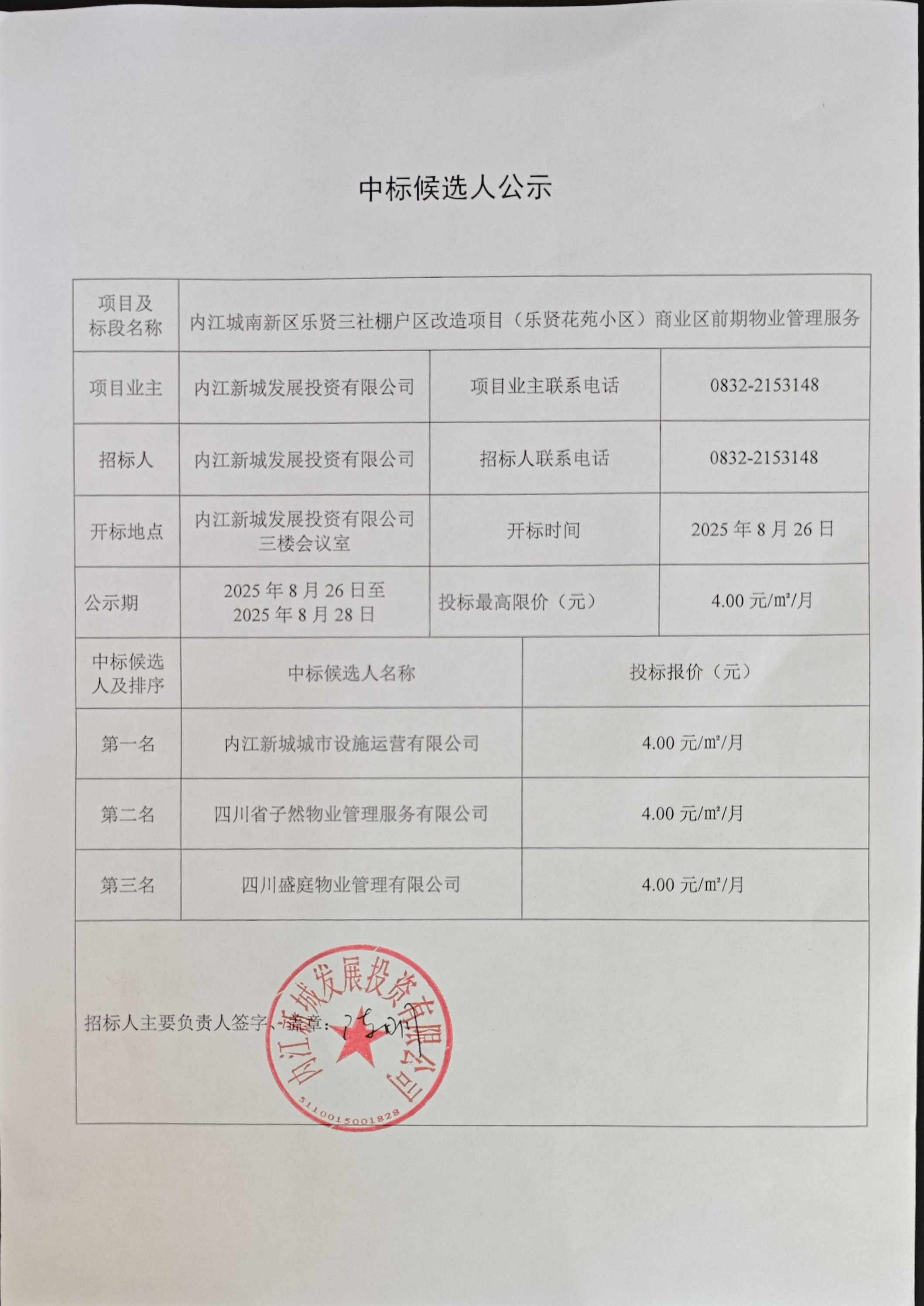內(nèi)江城南新區(qū)樂賢三社棚戶區(qū)改造項目(樂賢花苑區(qū))商業(yè)區(qū)前期物業(yè)管理服務(wù)中標候選人公示