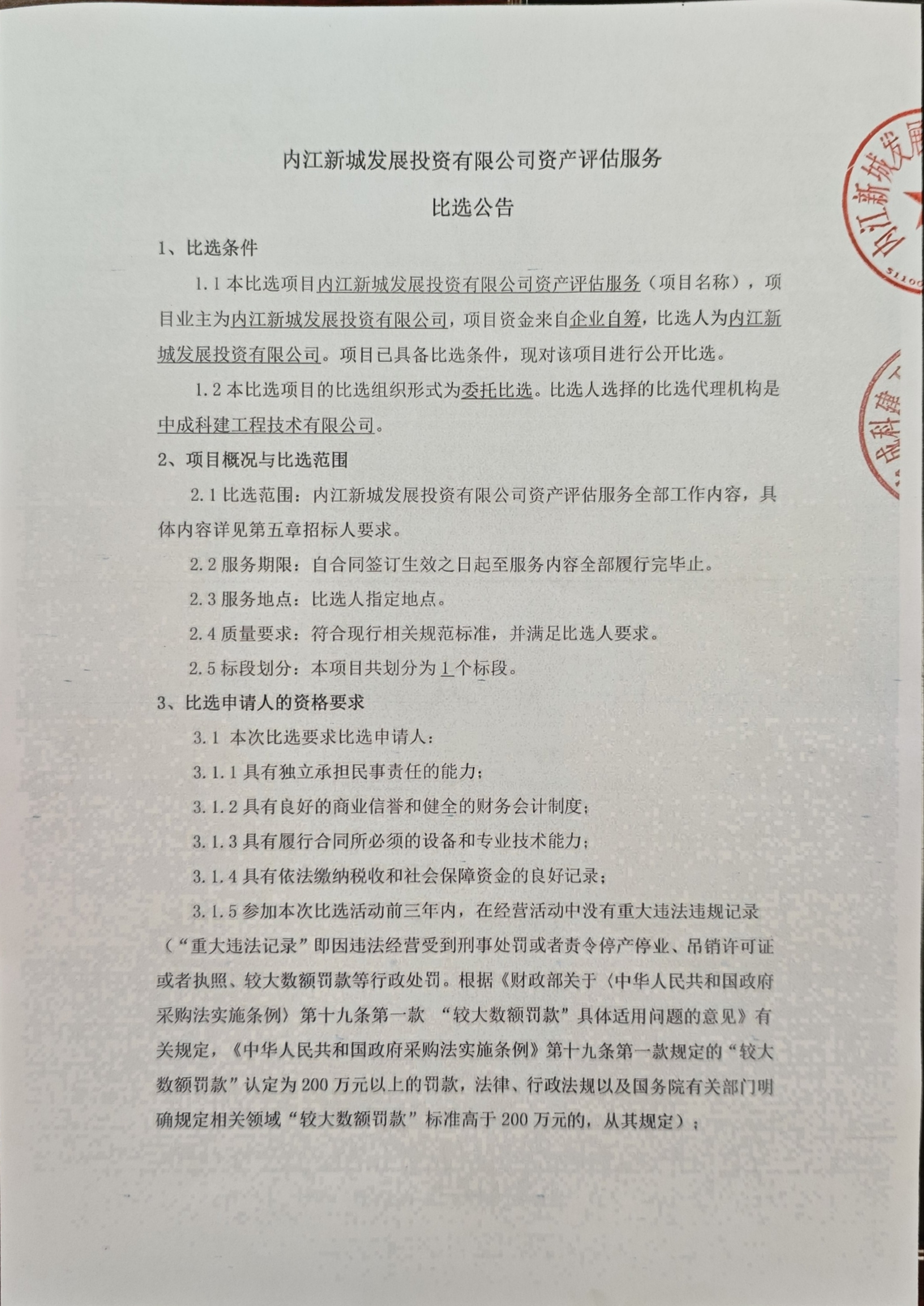 內(nèi)江新城發(fā)展投資有限公司資產(chǎn)評估服務(wù)比選公告